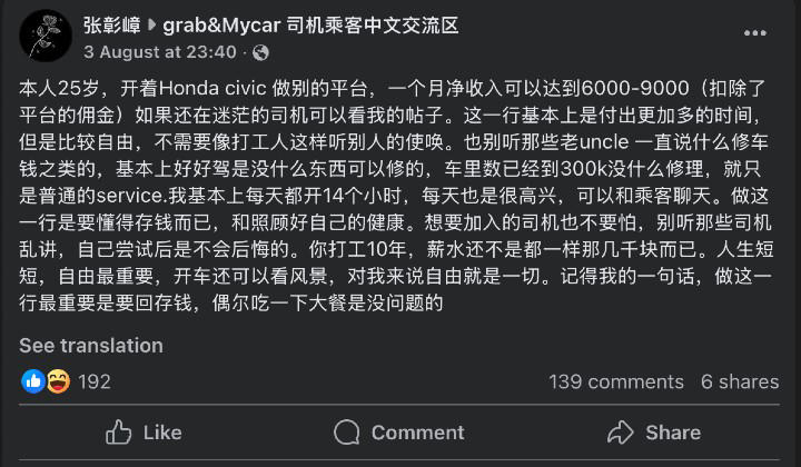 Seorang pekerja bergaji tetap yang memperoleh RM6,000 sebulan dengan 8 jam × 5 hari bekerja hanya melaburkan 173 jam sebulan. Berbanding pemandu ini yang bekerja ±420 jam sebulan, kadar jamannya hanya kira-kira 40% daripada pekerja bergaji tetap.